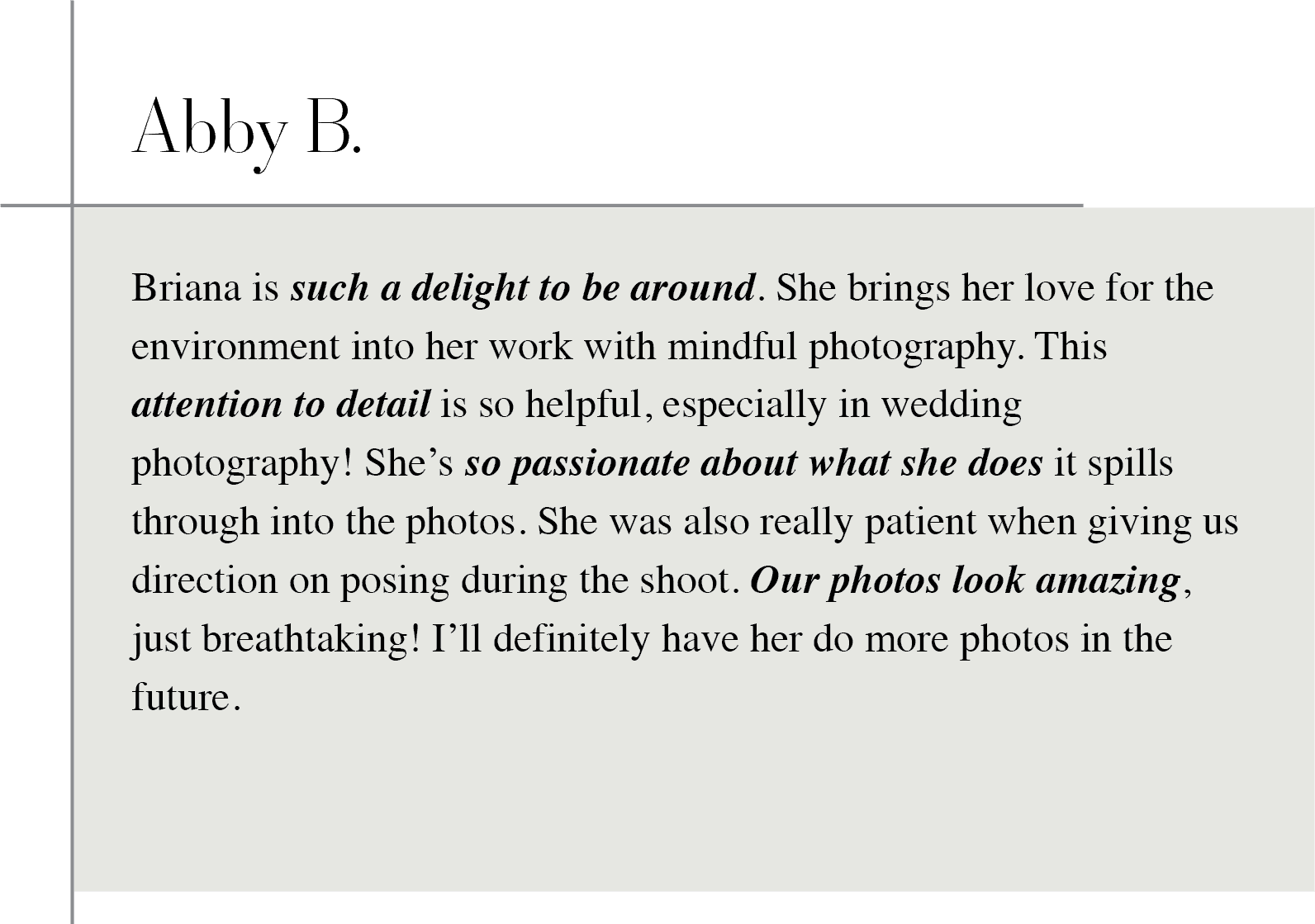 “When it came to having Briana with me on my wedding day, I felt like I was with an old friend. She made every family member feel so comfortable, and I actually feel like she helped mellow all of us out on what could have been a stress filled day. After she left every one of us kept gushing about how much we loved having her there.